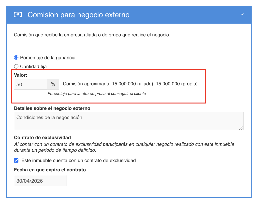 La sección de Comisión para negocio externo se refiere al valor que compartirías con un aliado al compartir la propiedad en alianza, en esta sección colocamos el porcentaje o la cantidad fija a compartir, si eliges la opción porcentaje, el valor se calcula con base al valor de la comisión de la empresa; también puedes registrar términos y condiciones de la negociación, incluso si tienes contrato de exclusividad podrás seleccionar el check y definir la fecha en la que este finaliza.