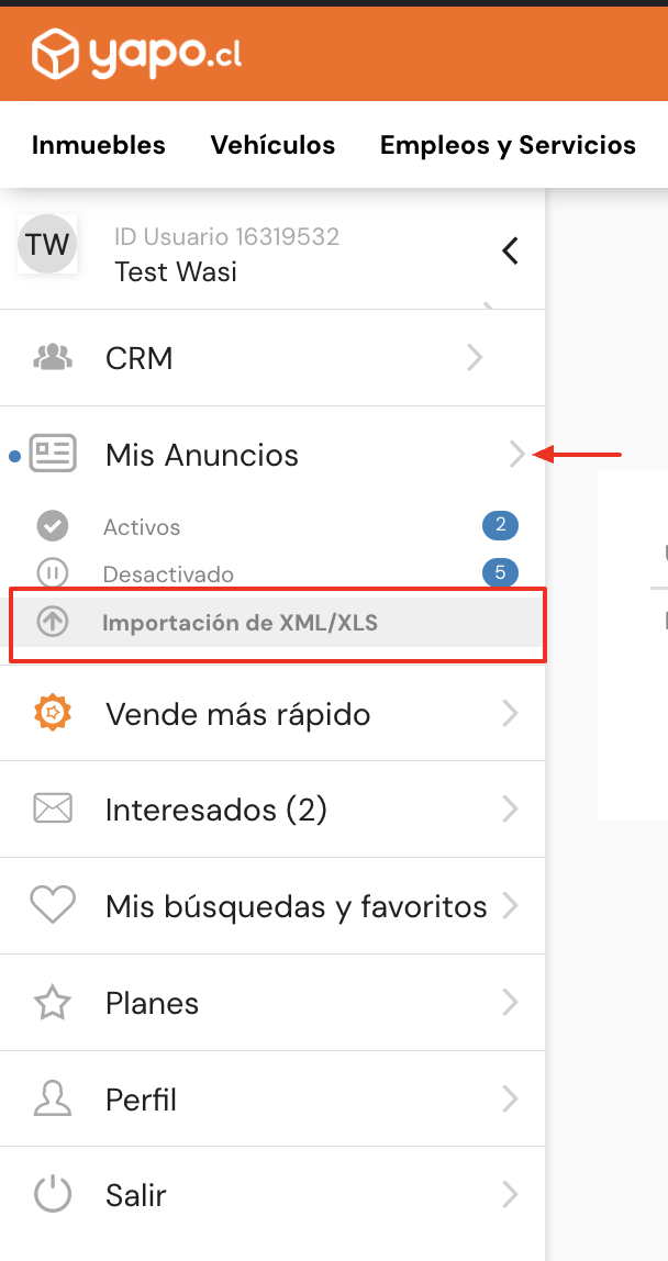 Una vez copiado el link XML debes ingresar a tu cuenta de Yapo.cl, allí debes acceder al menú principal desde el ícono de tu cuenta, luego das clic al apartado "Mis Anuncios" y luego en "Importación de XML/XLS"