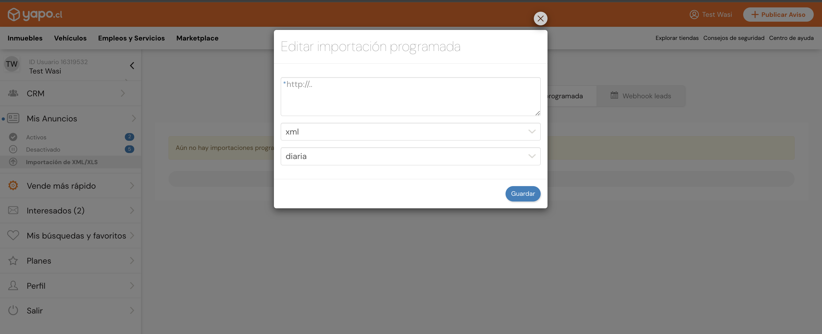 Por último, si deseas que los contactos que se generen desde el portal Yapo.cl también queden guardados en tu cuenta Wasi debes solicitar al equipo de Yapo.cl tu Api Key y el Nombre empresa estos datos debes ingresarlos en la misma ruta mencionada anteriormente y guardar los cambios dando clic en el botón Guardar