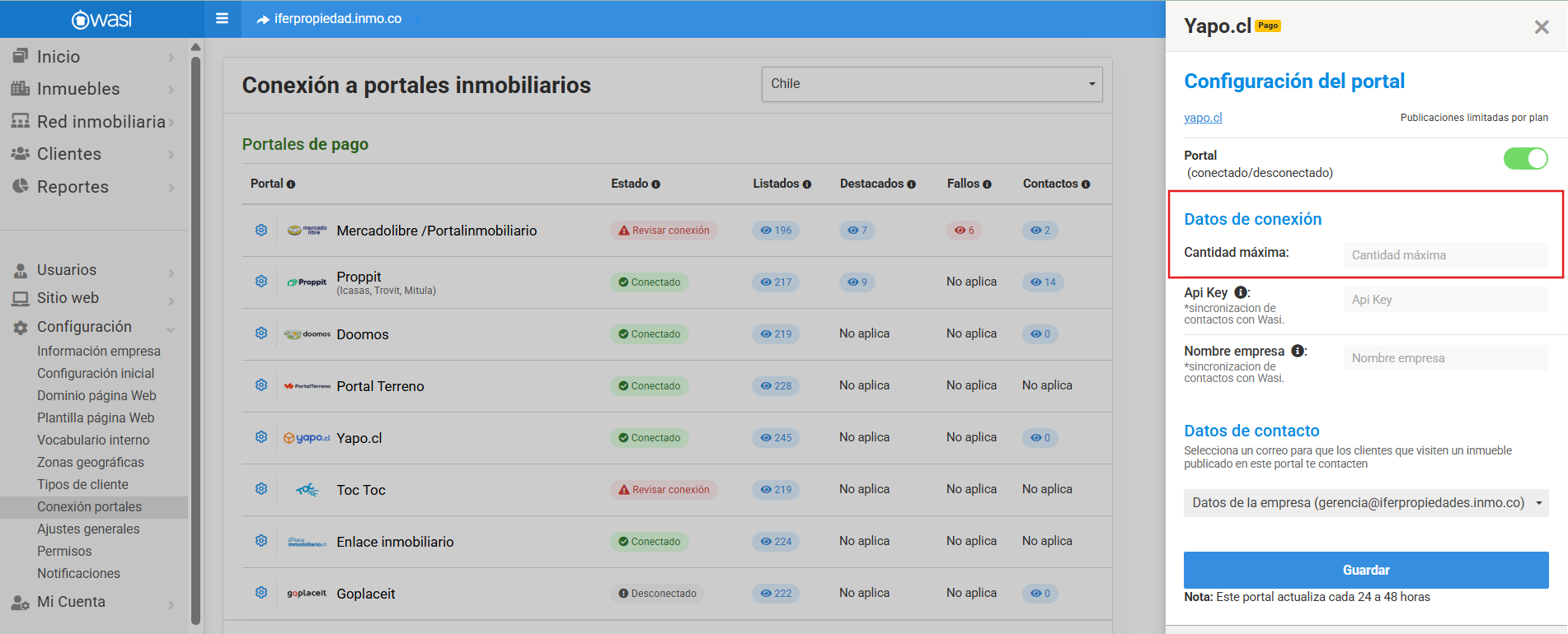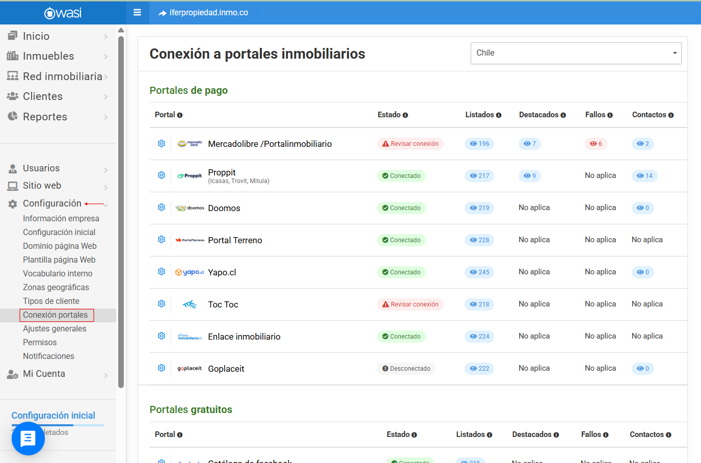 Para finalizar el proceso debes ingresar desde tu cuenta Wasi al módulo Configuración > Conexión portales.