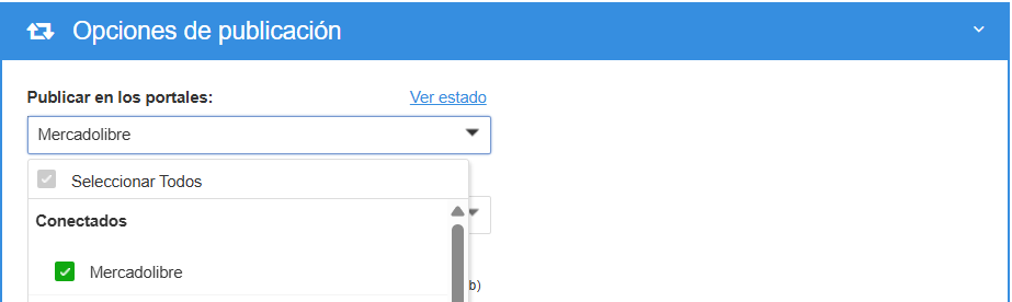 Si aún no tienes propiedades seleccionadas para enviar el portal debes ingresar a modificar cada una de propiedades y marcar la opción de publicación en Mercadolibre.
