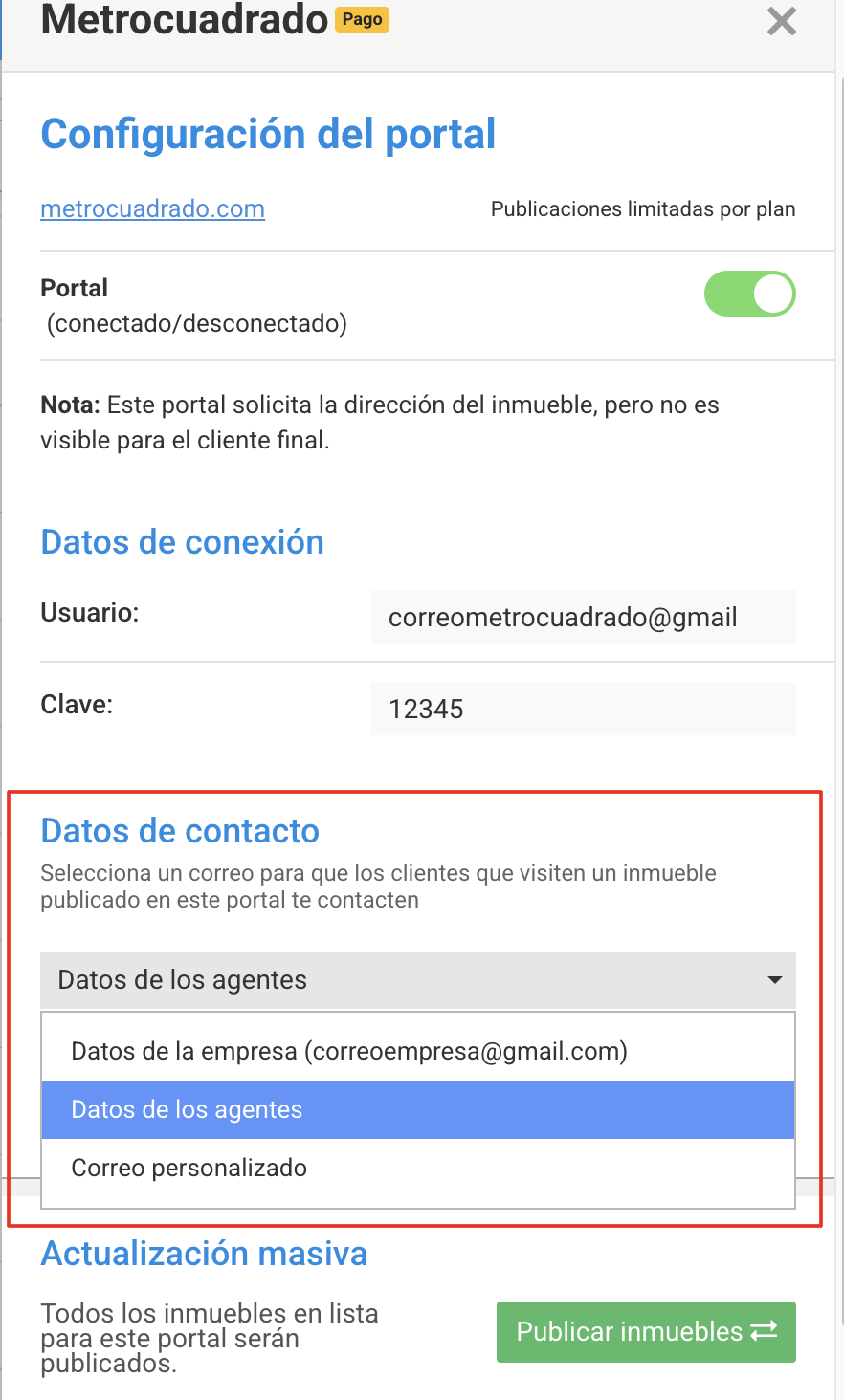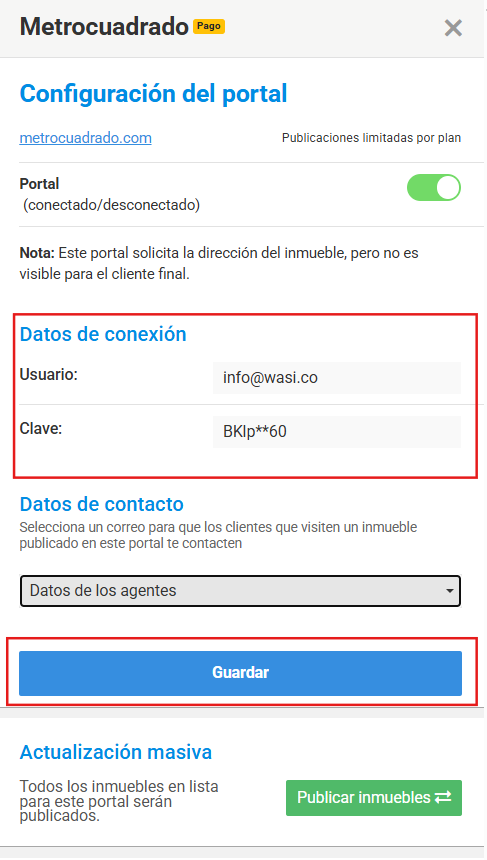⚠️ Para la integración de datos de contacto de los agentes, deben existir en el portal con el mismo correo que existen en Wasi, de lo contrario no se asignará la información del agente en la publicación de Metrocuadrado