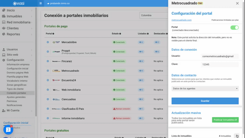 Con la información de credenciales que te comparte el portal vas a ingresar a tu cuenta Wasi y seleccionas en el módulo Configuración la opción de Conexión portales, selecciona el icono ⚙️ del portal Metrocuadrado, una vez hecho esto verás información sobre la configuración de portal, allí selecciona activar el portal en caso de que este inactivo.