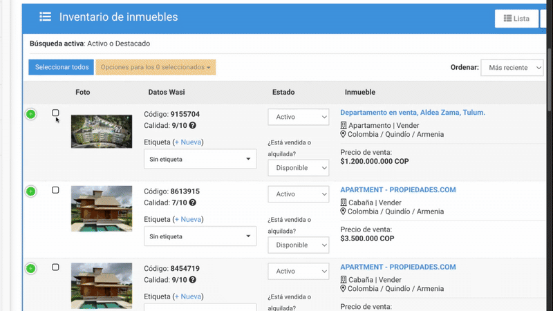 Otra opción que te brinda el sistema es la selección múltiple de la lista de inmuebles para enviar a marcar el portal y enviar a publicar de manera controlada.