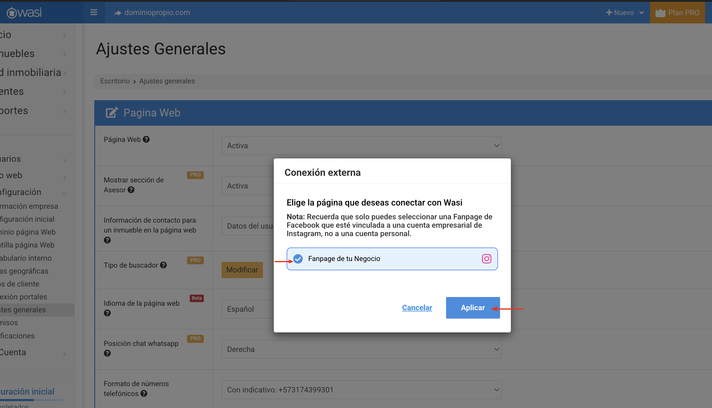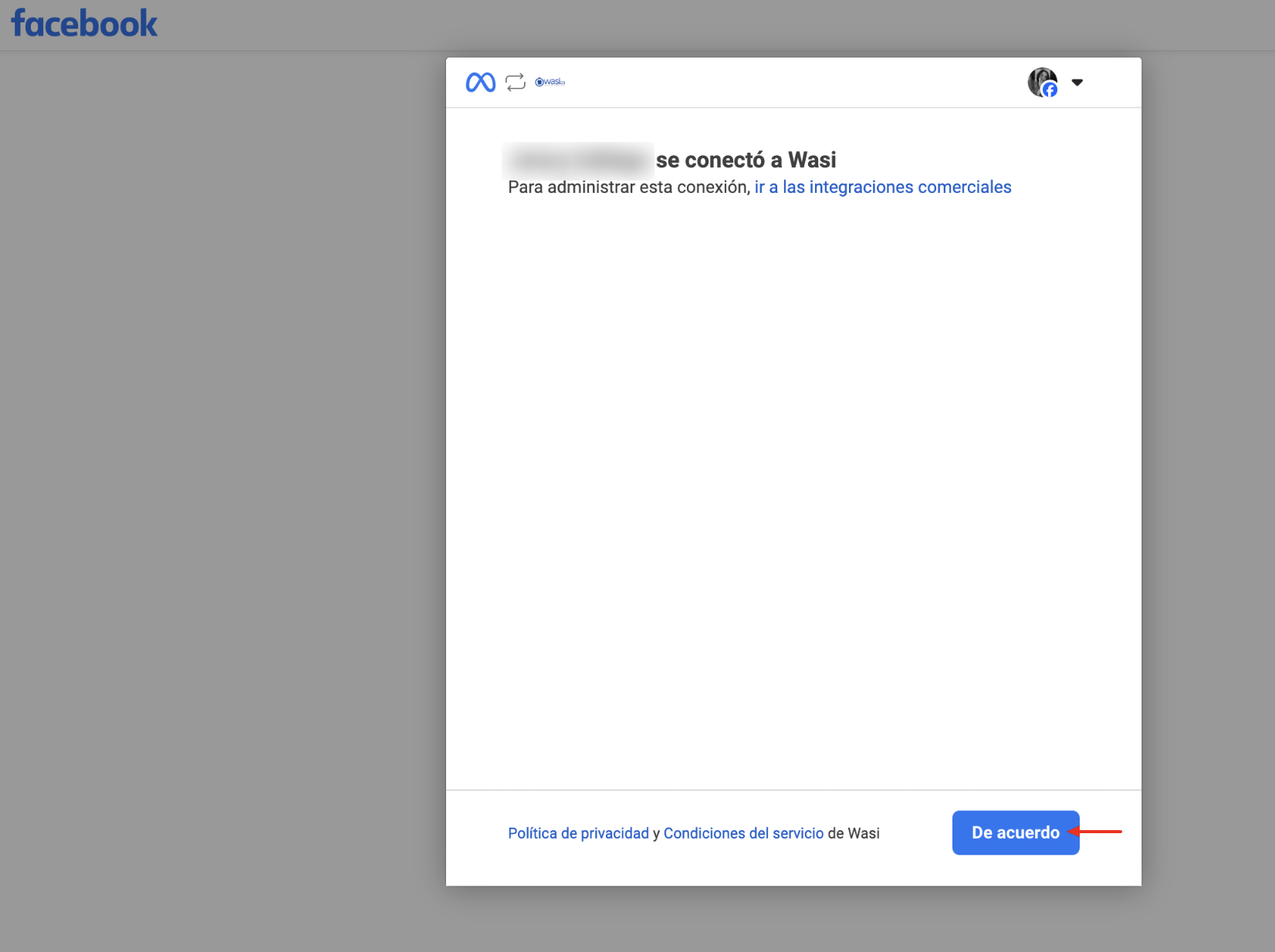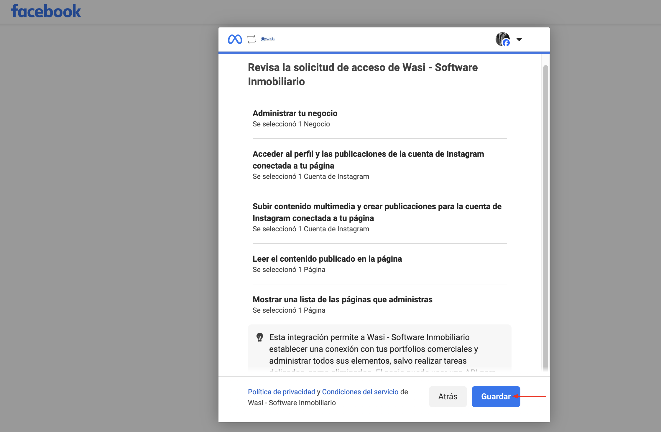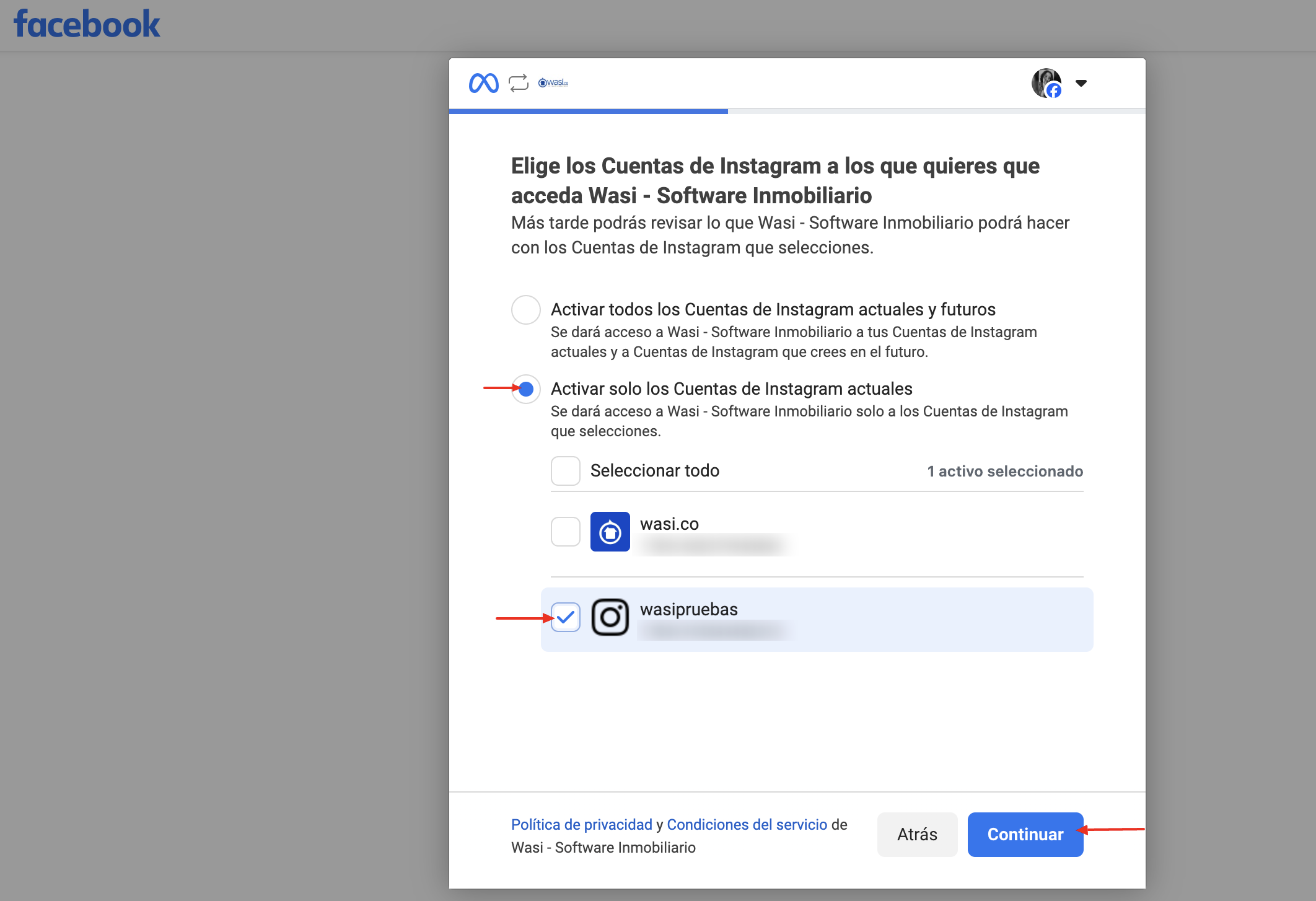 Finalmente el sistema te devuelve a la cuenta de Wasi para que selecciones y apliques el cambio a la cuenta de Instagram que vas a conectar.