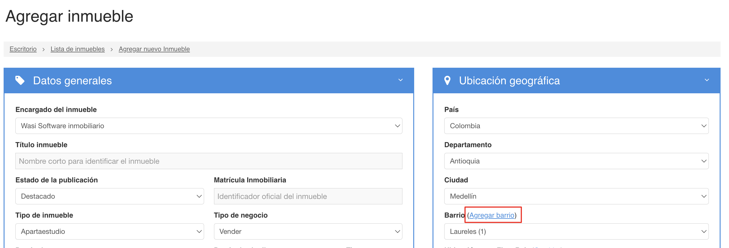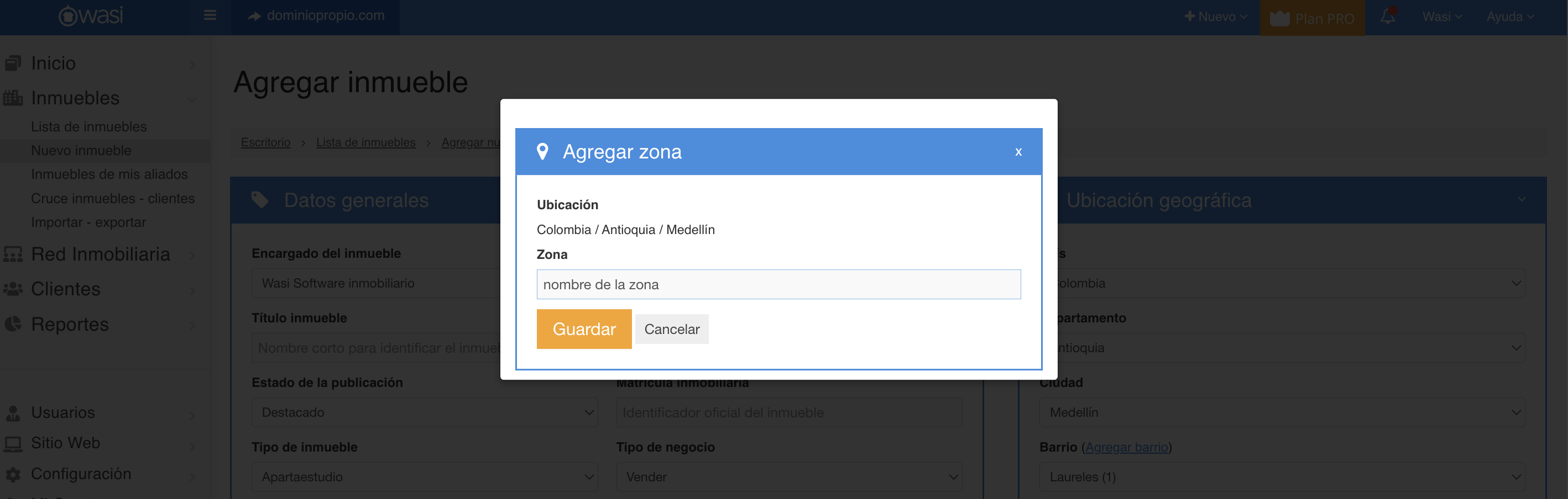 Cuando ya tengas creado el listado previamente a la creación del inmueble, podrás utilizar las zonas al momento de la creación o modificación de tu inmueble. Si no sabes aun que zonas necesitas y te das cuenta al momento de crear el inmueble, tienes también la opción de agregar zona (barrio, colonia o el termino que esté configurado para tu cuenta) desde la ficha del inmueble