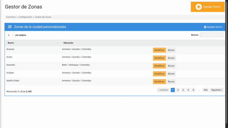Desde allí podrás empezar a crear tu listado al dar clic en agregar zona