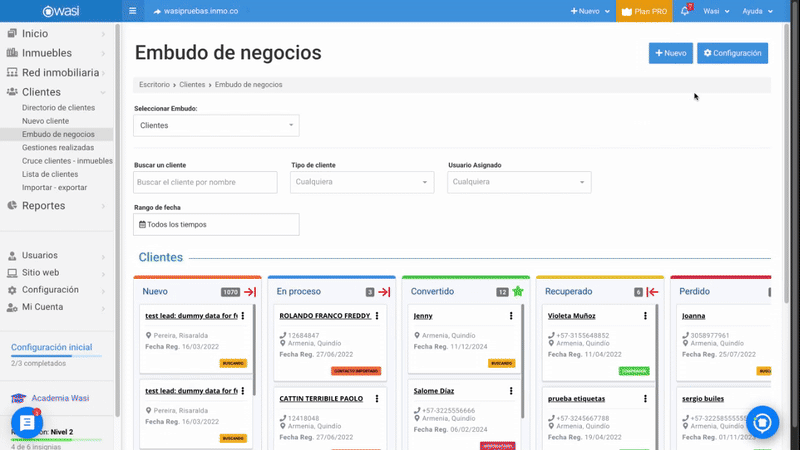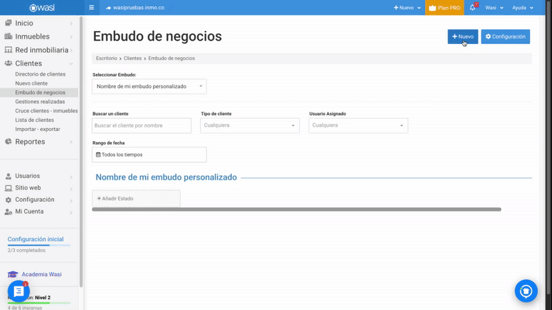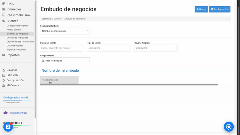 Define las etapas de tu proceso de gestión de clientes con ayuda del embudo de negocios de Wasi inmobiliario, esta herramienta es clave para gestionar y optimizar el proceso de ventas, desde el primer contacto con un cliente potencial hasta el cierre de la operación. Por ello, es importante que crees las etapas acorde a tu proceso de negociación y deben estar definidas con el propósito de filtrar tus clientes y concentrarte en los que son potenciales. A continuación te enseñamos a crear tu embudo personalizado: