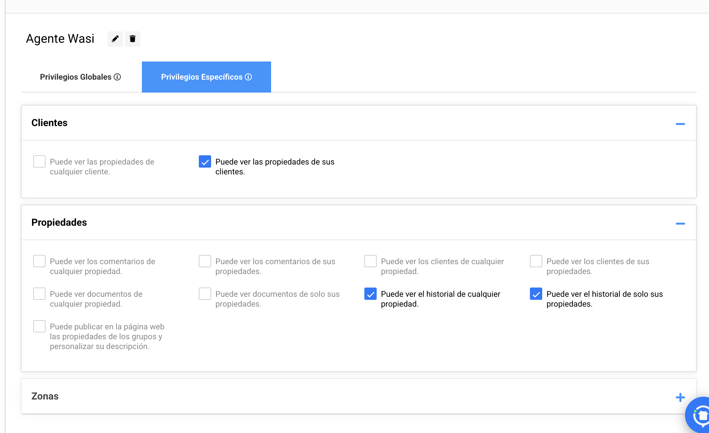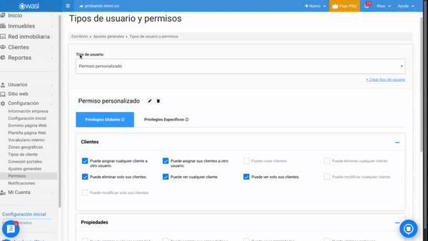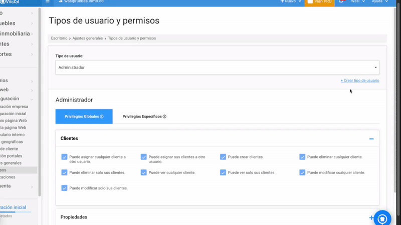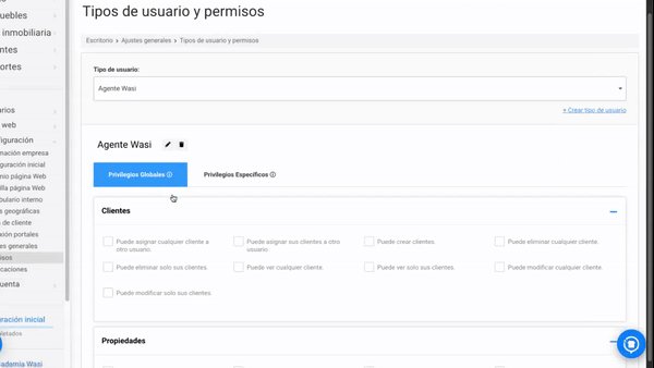 Una vez creas el nombre se habilitan todas las opciones que puedes marcar de manera personalizada las que necesitas para ese tipo de usuario, primero encuentras los Privilegios Globales en el cual podrás habilitar permisos para clientes, propiedades, agenda y zonas. Lee detalladamente cada opción antes de marcar el check y así podrás definir el alcance del tipo de usuario que estás creando