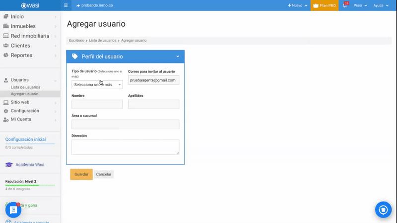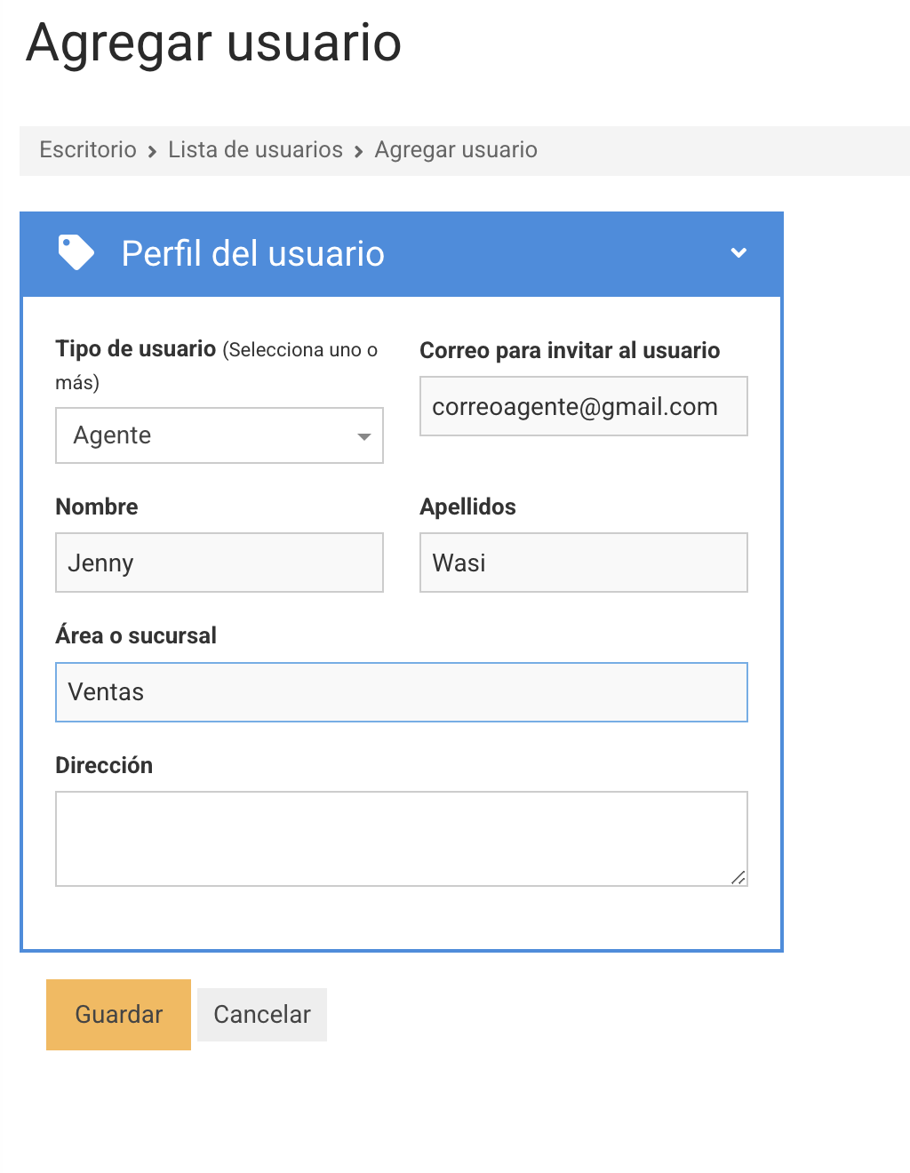 Si ya tienes los permisos personalizados o vas a utilizar los estándar, crea las cuentas a tus usuarios para que puedan acceder a la cuenta desde el modulo Usuarios > Agregar usuario, allí encontrarás los campos necesarios para invitar al agente a ser parte de tu cuenta.