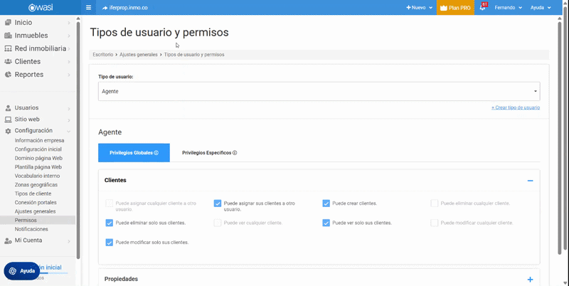 Nota* En el rol que creamos como ejemplo, al asignarlo a un agente este podrá asignar sus clientes a otro usuario, ver solo sus clientes y eliminarlos, así mismo solo podrá modificar y ver sus propiedades, en lo que respecta a los privilegios específicos solo podrá ver los clientes, comentarios e historial de sus propiedades en Wasi.